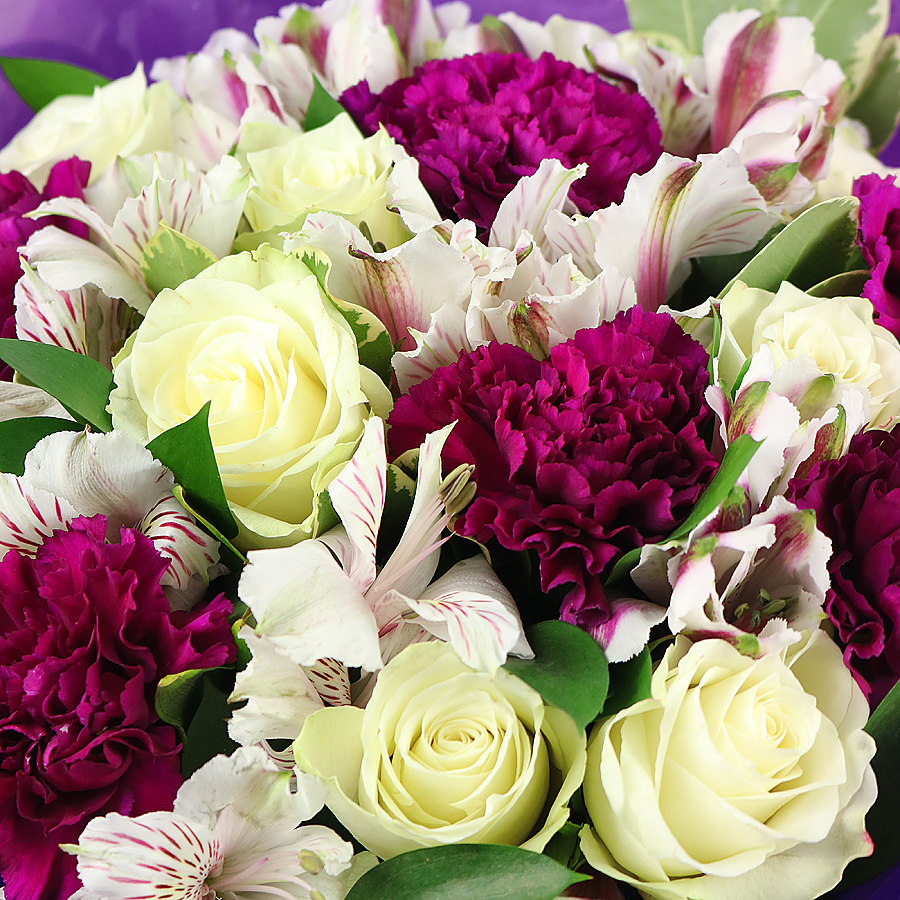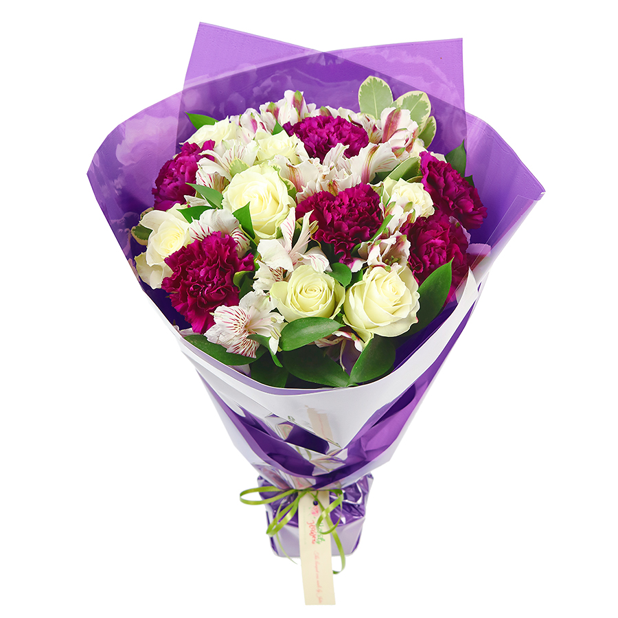 Introducing our Summer Blossom Delight, a captivating bouquet featuring white roses, alstroemeria, and purple carnations, paired with vibrant greenery. This arrangement embodies the lively and refreshing spirit of summer.