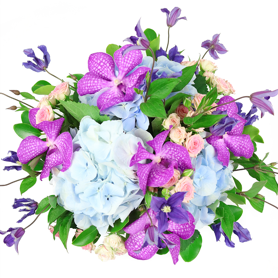 Immerse yourself in the breathtaking beauty of our Tropical Paradise Floral Arrangement. This lavish bouquet showcases the vibrant pink vanda, elegant cleamtis, serene blue hydrangeas, and soft pink spray roses, creating a stunning display of color and texture.