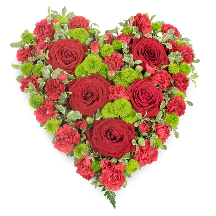 Express deep affection and heartfelt sympathy with the Enduring Love Heart funeral tribute from Flowers Gipsy Hill. This elegant heart-shaped arrangement features classic red roses, rich red carnations and mini green chrysanthemums, beautifully accented with pittosporum and leather leaf foliage. Designed to convey love, respect and appreciation, it is a thoughtful choice for funerals, memorials or celebrations of life.