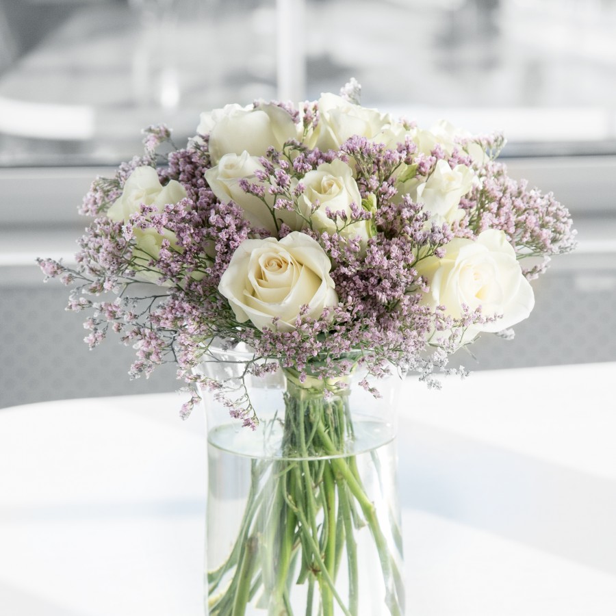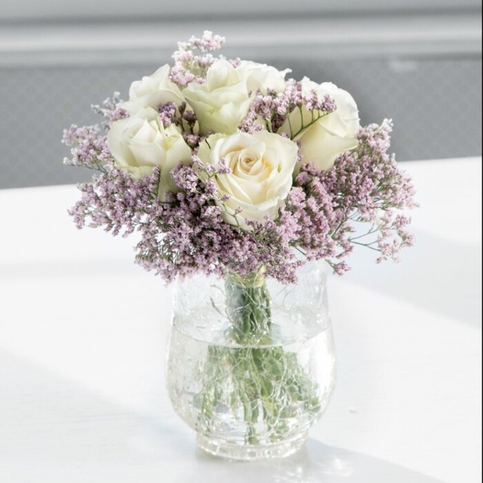 Our elegant white rose display is perfect for any occasion. Featuring pristine white roses arranged with delicate purple limonium, this bouquet offers both beauty and uniqueness.