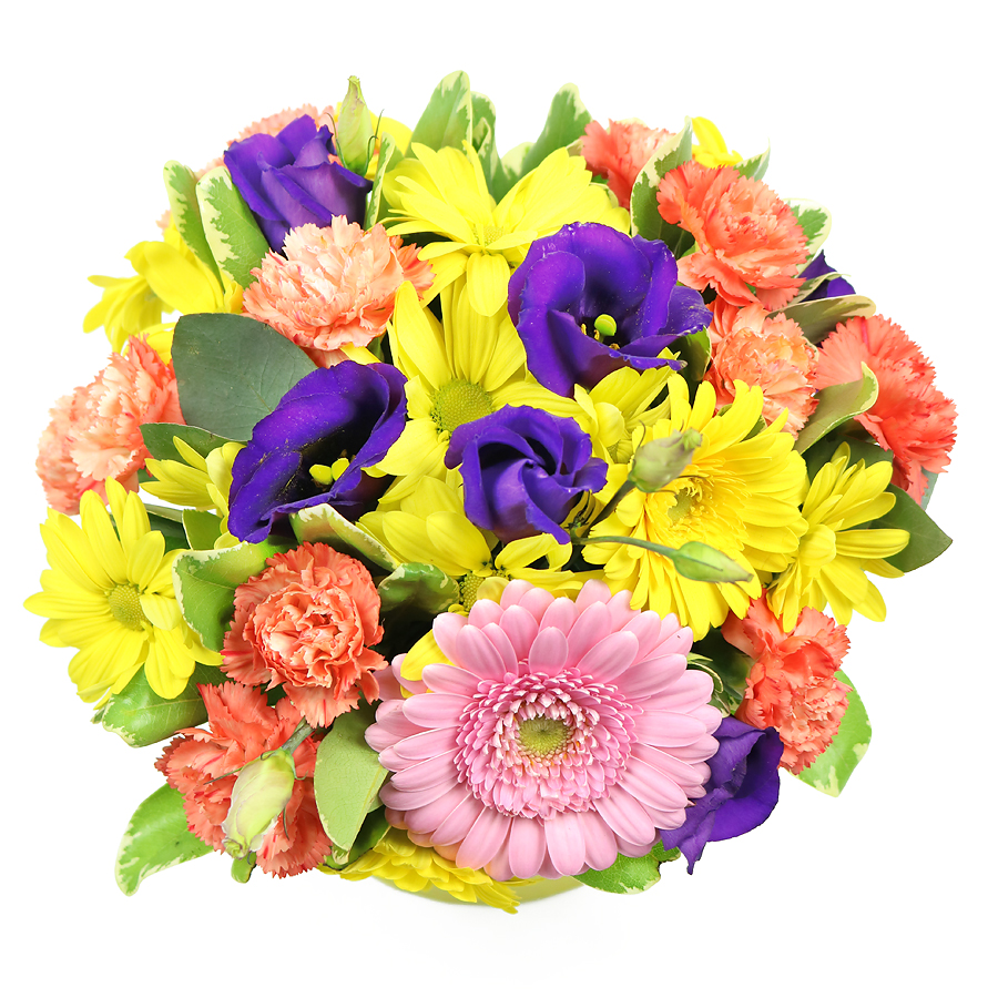 Easter is the time to rejoice and be thankful for the gift of life, love and joy. Let your joy burst forth like flowers in the spring! Express your love and devotion with this lovely combination of pink and yellow gerberas, orange carnations, purple lisianthus and fresh greenery!