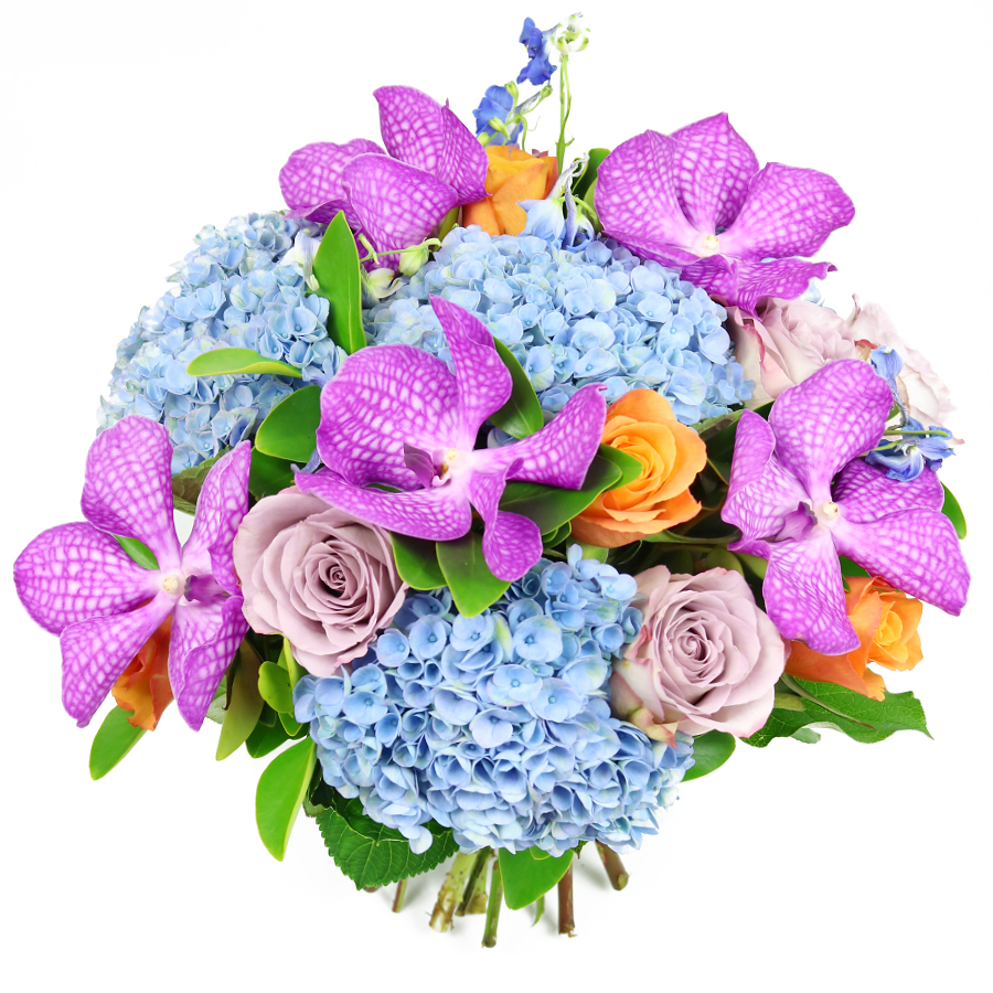 Celebrate beauty with our Radiant Bloom Arrangement. This captivating bouquet combines vibrant orange roses, tranquil blue hydrangeas, and charming pink vandas, creating a unique and eye-catching display that radiates warmth and elegance.