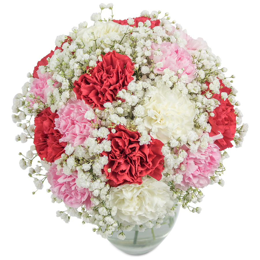 This magical bouquet is made from white, red and pink carnations and is delicately decorated with gypsophila flowers to add to its glamorous look! It is certain to bring smiles and a great festive feel to the people you love!